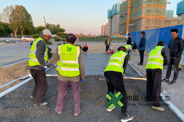 透水地坪施工:將定量石子,水泥,膠結劑,水投入攪拌均勻,鋪裝前用水濕潤路基,墊層需要振搗平整,面層用水泥抹平機收光抹平,施工后用農膜進行覆蓋養生兩天后灑水養護,時間約五到七天,期間應設隔離帶,避免行人通過,面層干燥后噴涂面層封閉劑(又稱面罩劑)。